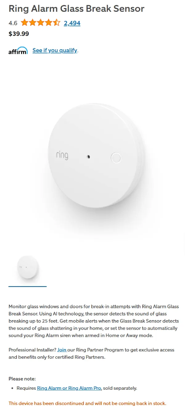 On the glass break sensor product page, the device no longer shows as a normal in‑stock accessory, and the product listing clearly mentions that “This device has been discontinued and will not be coming back in stock.”