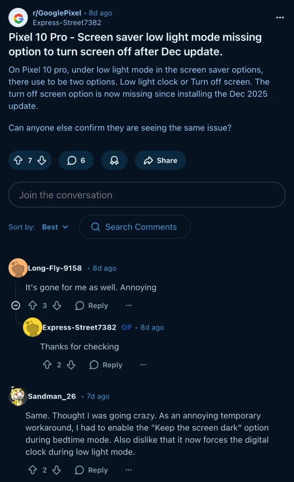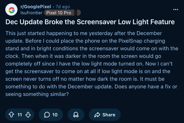 Google’s December 2025 update for Pixel phones appears to have broken the screensaver low light mode for multiple users across several models, with complaints popping up on Reddit and Google’s support forums.