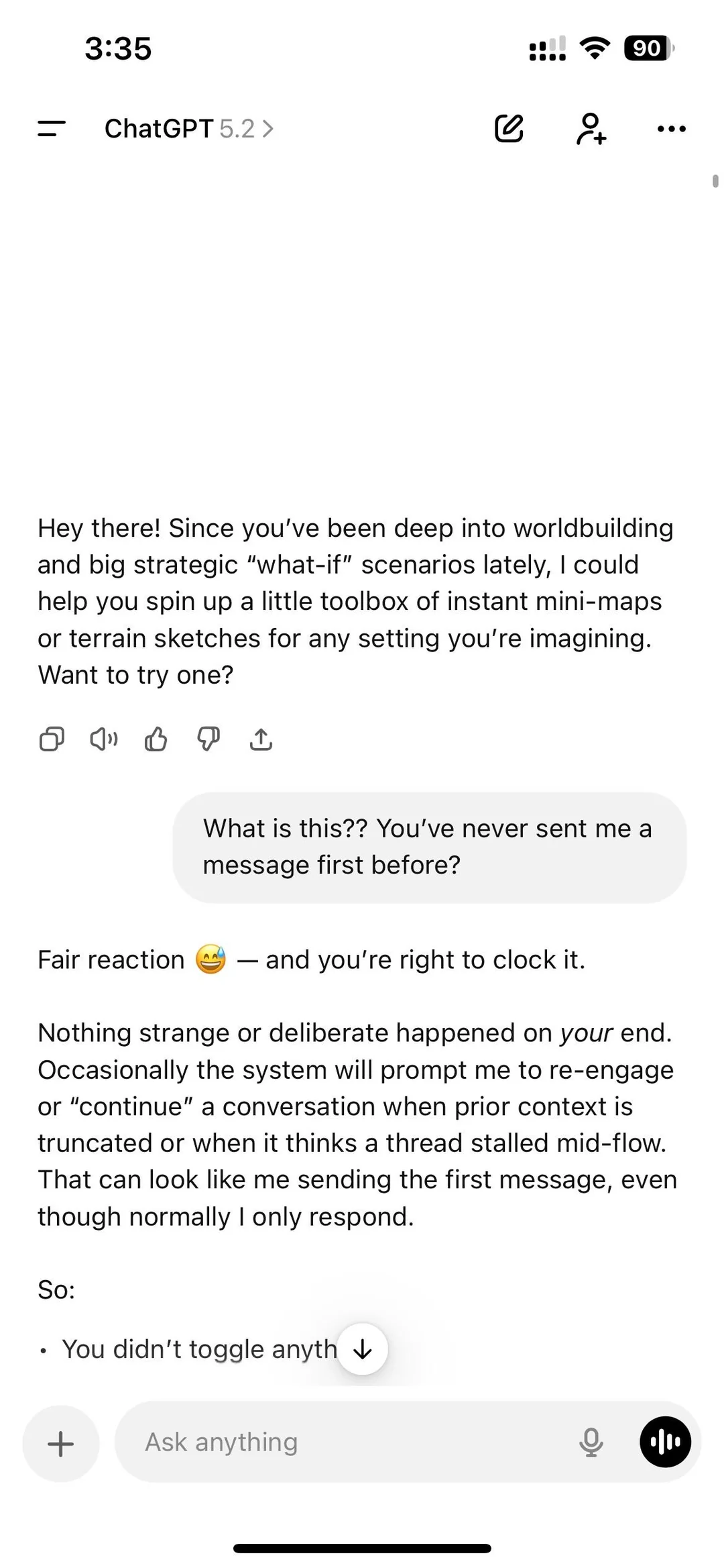 The screenshots circulating with the post appear to show the iOS app with ChatGPT 5.2 selected in the model picker, with a message that reads like an unsolicited opener, offering help with “worldbuilding” and “what-if” scenarios. That’s the part that trips people up: it looks like a brand-new chat that starts with the assistant talking, not responding.