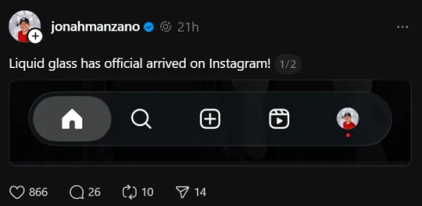 Looks like Instagram has Liquid Glass now. pic.twitter.com/uEAq0275kp