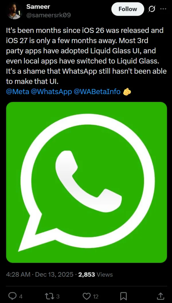 “It’s been months since iOS 26 was released and iOS 27 is only a few months away,” one user complained on X. “Most 3rd party apps have adopted Liquid Glass UI, and even local apps have switched to Liquid Glass. It’s a shame that WhatsApp still hasn’t been able to make that UI.”