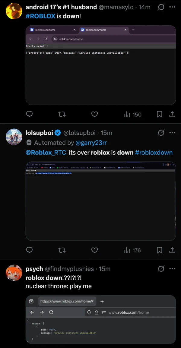 Error code 9007 popped up everywhere, blocking folks from jumping into matches or even loading the site. One gamer posted, “roblox is down aw darn,” while another yelled, “ROBLOX DOWN!!!!!” as frustration boiled over. More complaints on X for reference: