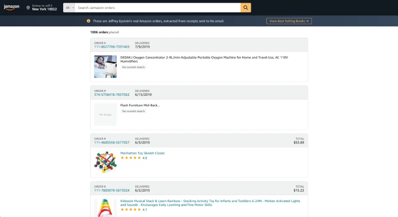 It’s joined by JAmazon, which recreates Epstein’s order history. The interface resembles a standard Amazon order history page, listing mundane purchases such as electronics and books alongside product images and timestamps.