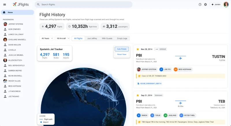 The suite also includes JFlights, which looks like a professional flight tracking dashboard. It catalogs a staggering 4,297 flights and over 10,352 hours of flight time. You can filter by year, specific aircraft like N212JE or N908JE, and even toggle between “Just Jeffrey” or flights with guests. It’s an incredibly detailed look at the movement of his fleet over two decades.