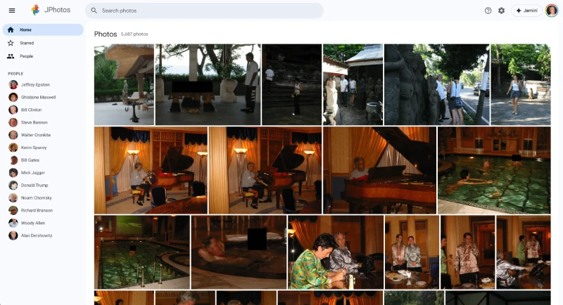One of the most striking examples is JPhotos, a clone of Google Photos that pulls in over a thousand images from the files. The UI looks remarkably like the real thing, featuring a clean grid of thumbnails showing everything from mansion interiors to evidence documents.