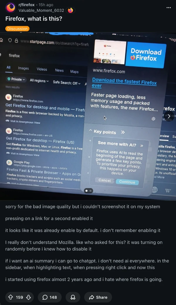The confusion started because when you first trigger Link Preview, Firefox asks if you want to download an AI model for summarizing pages. That opt-in dialog has a big “Continue” button and a smaller “Cancel” option, which made people think AI was being forced on them.